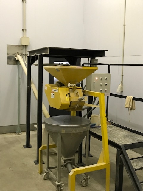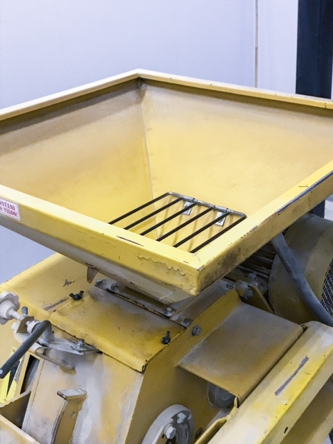 麦芽を粉砕する機械です。粉砕された麦芽は隣の仕込み工程へホースの中を通り運ばれます。