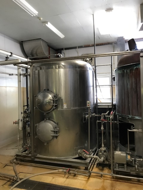 煮沸が終わるとワールプール(左側)に移され麦汁を撹拌して不純物を取り除きます。(ワールプール)