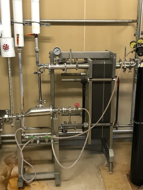 取り除かれた高温の麦汁は一気に約8度まで冷却され、発酵タンクへと移されます。(冷却装置)